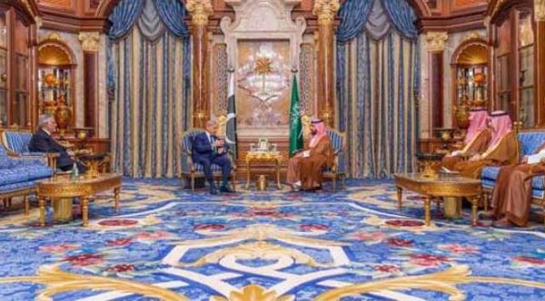 وزیراعظم محمد شہباز شریف اور سعودی عرب کے ولی عہد و وزیر اعظم شہزادہ محمد بن سلمان بن عبدالعزیز السعود سے ملاقات میں نائب وزیراعظم و وزیر خارجہ سینیٹر محمد اسحاق ڈار بھی موجود تھے۔